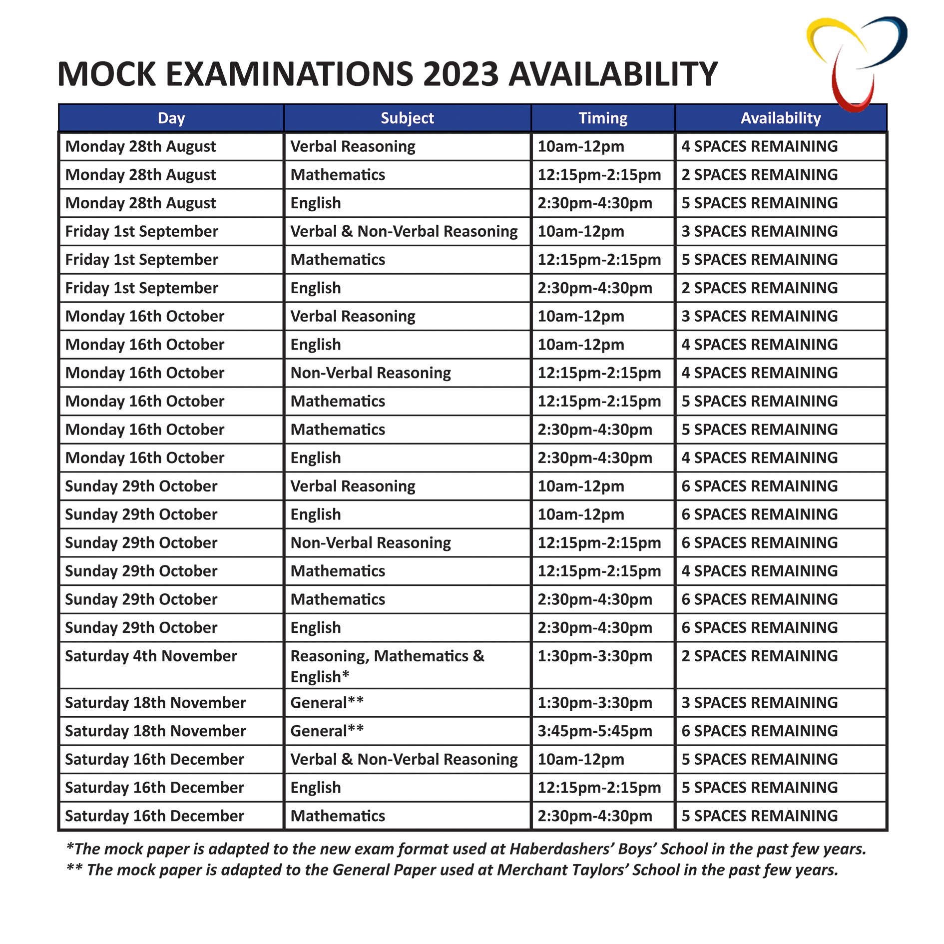 The mock examinations are modelled on 11+ entrance examination papers to Grammar and Independent Schools in the area. The August and September mock examinations are modelled on 11+ entrance papers to North London Grammar Schools and schools that are part of the South West Consortium, while the mock examinations that take place in October, November and December are modelled on 11+ entrance papers to Independent Schools in the North London area.