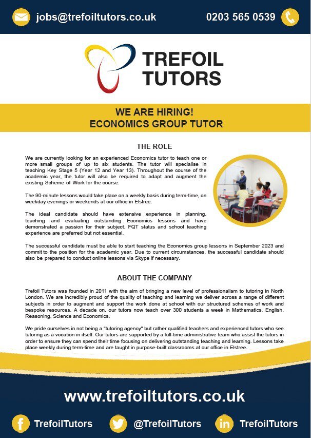 Trefoil Tutors are delighted to share a vacancy for a Tutor of Economics to join our team in September 2023.