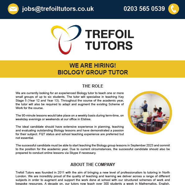 Trefoil Tutors are delighted to share a vacancy for a Tutor of Biology to join our team in September 2023.