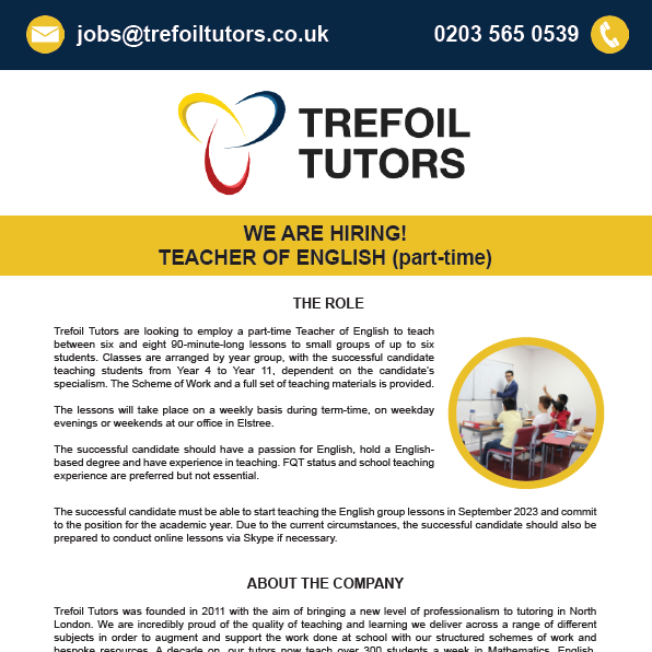 Trefoil Tutors are delighted to share a vacancy for a part-time Tutor of English to join our team in August 2023.