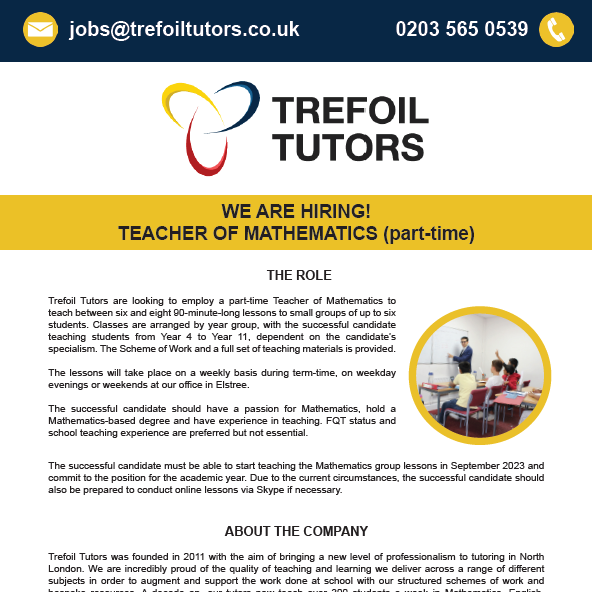 Trefoil Tutors are delighted to share a vacancy for a part-time Tutor of Mathematics to join our team in August 2023.